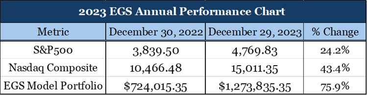 If the EGS Model Portfolio were a hedge fund, it’s 75.9% growth would have ranked #1 in the 2023 Wall Street Journal’s Winner Circle rankings.