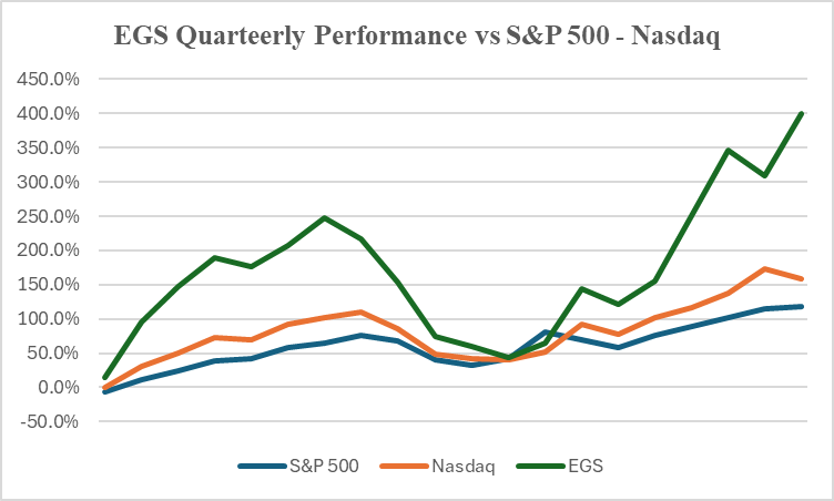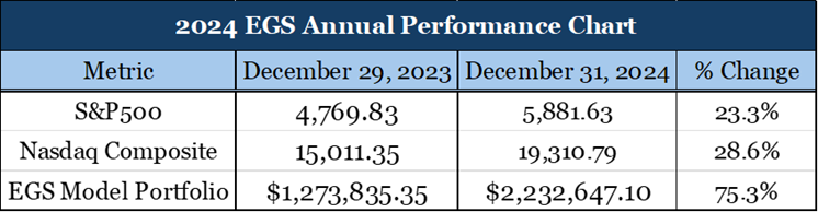 According to Business Insider, the top performing hedge fund in 2024 produced a return of 19.7% for its investors. Clearly, if the EGS Model Portfolio were a hedge fund, it’s 75.3% growth would have been a hugely dominant leader of ALL hedge funds.