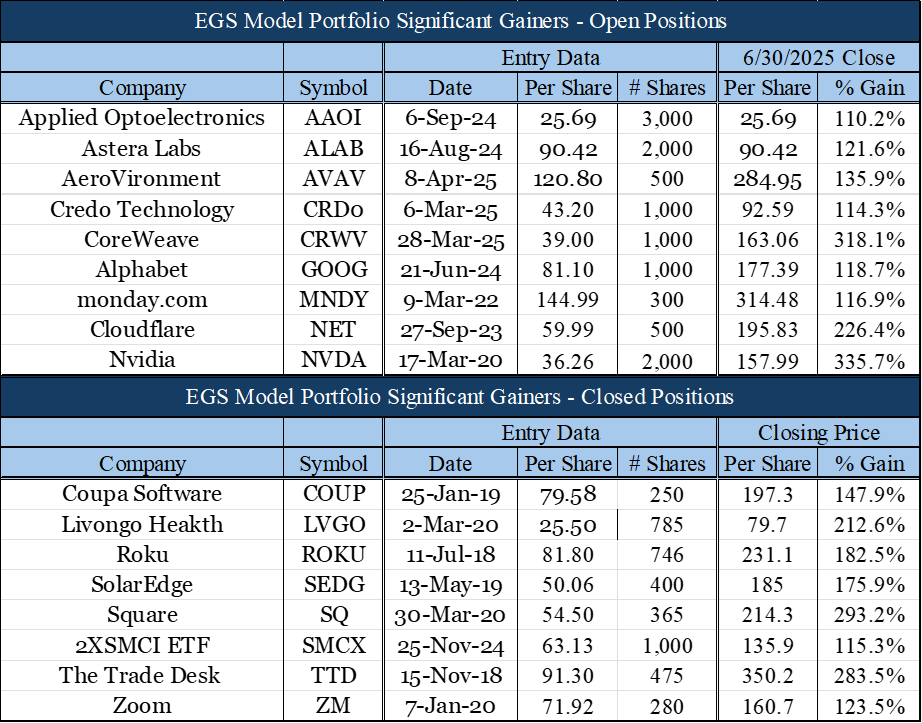 The following stocks did much of the “heavy lifting” for the EGS Model Portfolio. To be sure, there were negative individual stock performances, and they are included in the overall performance of the portfolio.