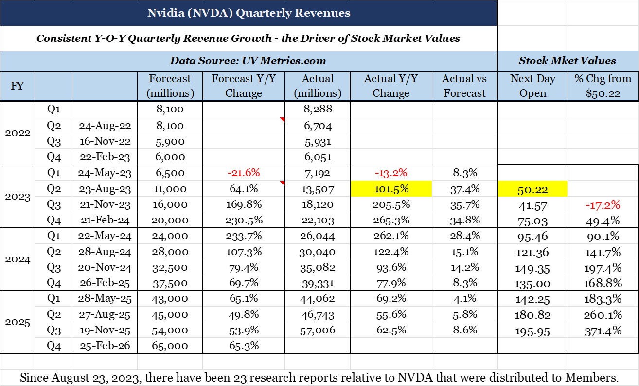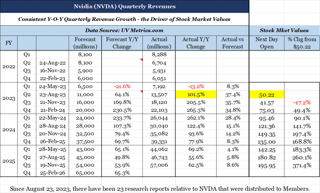 To illustrate that follow-up service, after I entered Nvidia as a selection for the EGS Model Portfolio, I discovered 29-relevant information sources that were shared with Members on the day of discovery. Most of these discoveries enabled Members to “stay-the-course” and maintain their Nvidia positions, thereby precluding the temptation to prematurely nail down profits.
