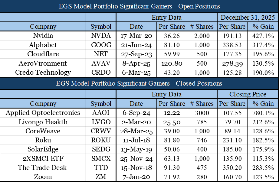 The following stocks did much of the “heavy lifting” for the EGS Model Portfolio. To be sure, there were negative individual stock performances, and they are included in the overall performance of the portfolio.